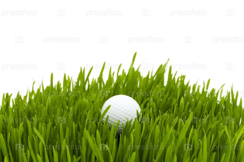 Мячик для гольфа на траве на белом фоне