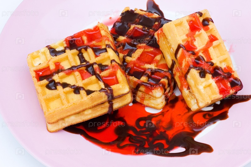 Бельгийские вафли с фруктовым и шоколадным сиропом на тарелке крупным планом