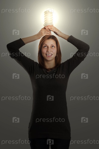 Симпатичная девушка держит люминесцентную лампу над головой