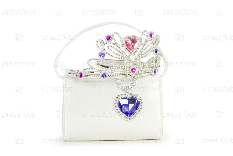 Женская сумочка, кулон и диадема на белом фоне