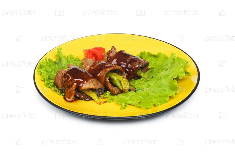 Рулеты из говядины с овощами на тарелке на белом фоне