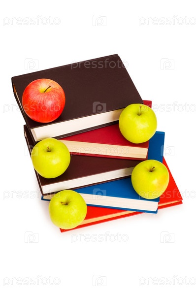 Яблоки и книги на белом фоне