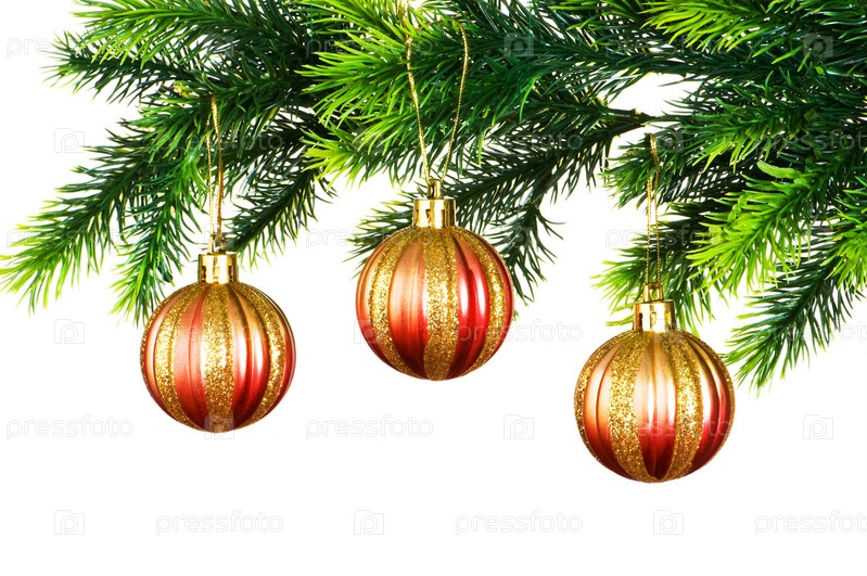 Елочные украшения на ветке на белом фоне