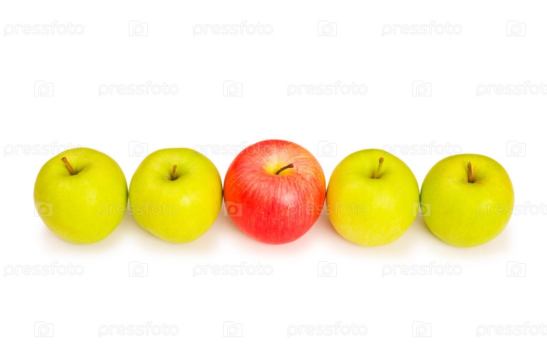Красное яблоко среди зеленых на белом фоне