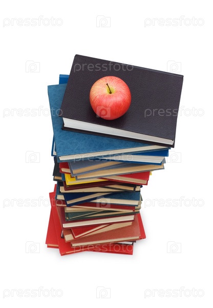 Яблоко на стопке книг на белом фоне