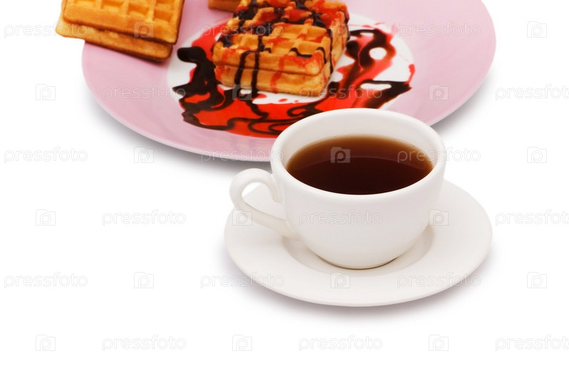 Чашка чая и бельгийские вафли на белом фон