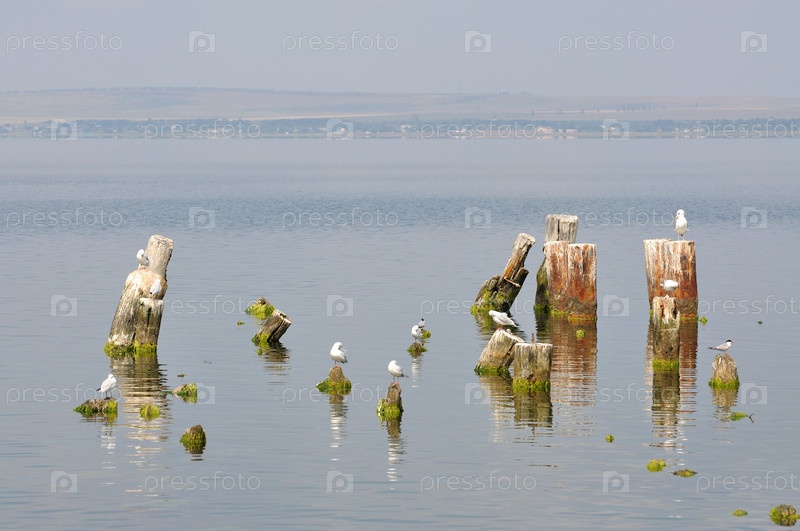 Чайки на пеньках в Таманском заливе