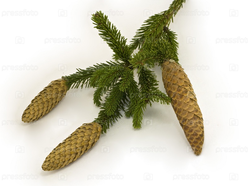 Елочная ветка с шишками на белом фоне