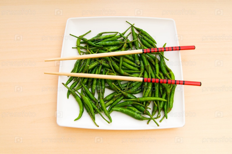 Зеленый перец на тарелке и японские палочки для еды