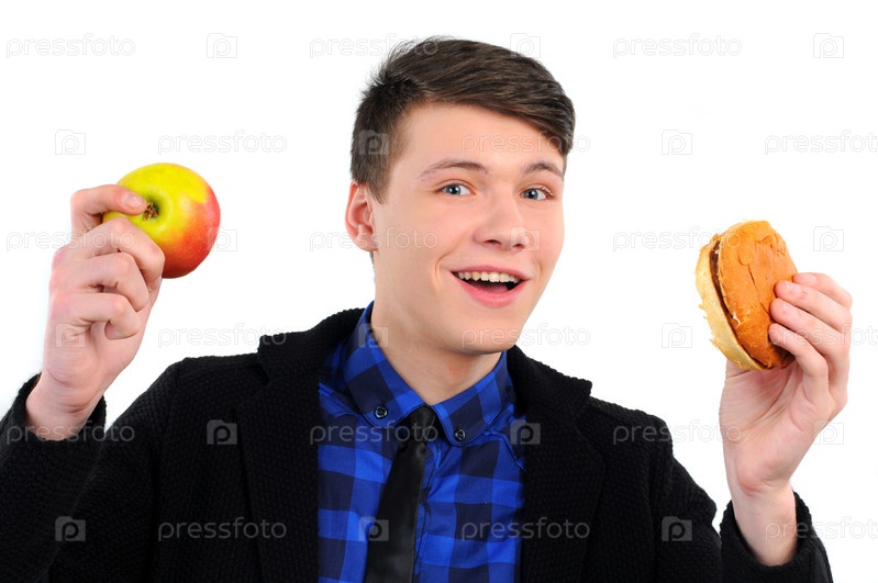 Молодой человек, держащий яблоко и гамбургер, изолированный на белом
