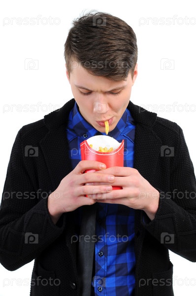 Изолированный мужчина ест картошку фри