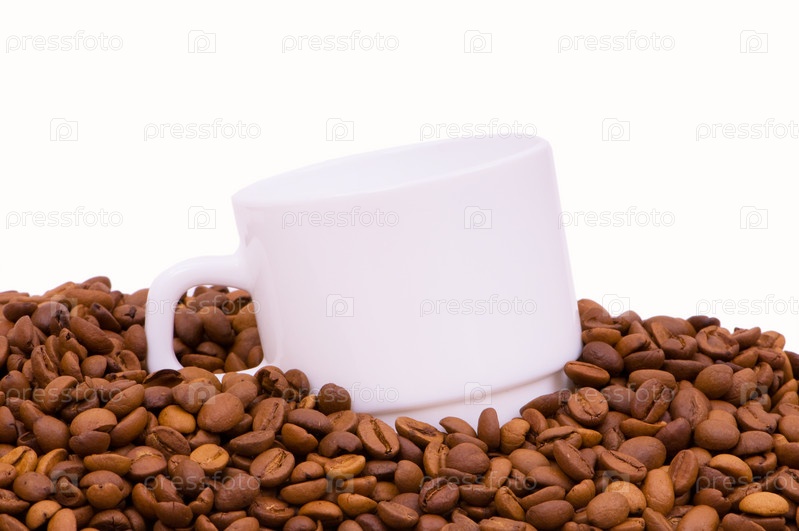 Кружка в куче кофейных зерен на белом фоне