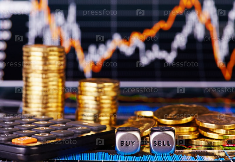 Кубики со словами "продать" и "купить", золотые монеты, калькулятор и финансовые индикаторы как фон. Выборочный фокус