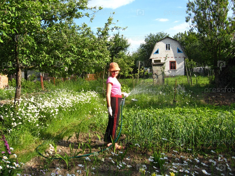 Девушка поливает огород