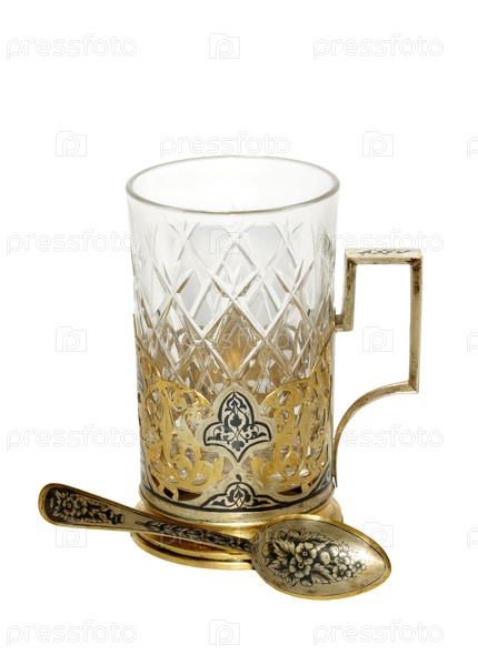 Антикварный золотой подстаканник с хрустальным стаканом и золотой ложкой