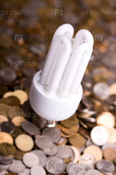 Энергосберегающая лампа на фоне монет