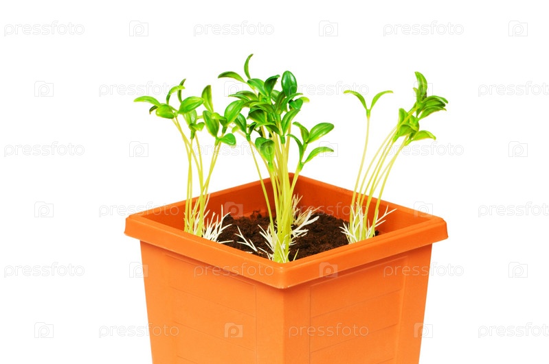 Зеленые ростки в горшке на белом фоне