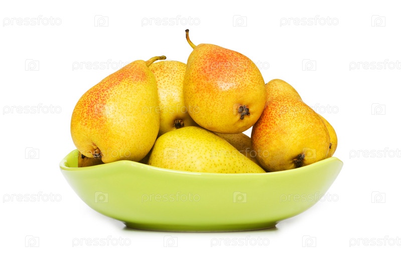 Полная тарелка груш на белом фоне