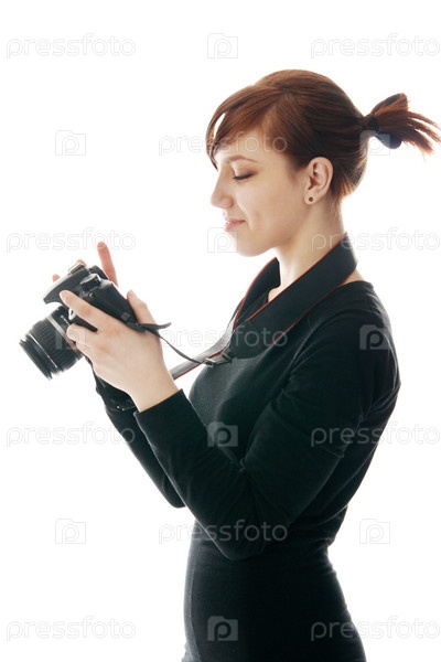 Девушка с фотоаппаратом в руках на белом фоне