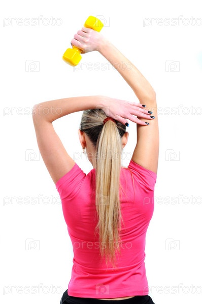 Женщина занимается фитнесом с гантелями