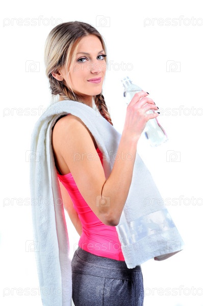 Портрет уверенной молодой женщины в спортивной одежде, держащей бутылку воды