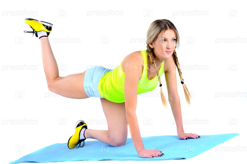 Красивая молодая женщина делает упражнения для укрепления мышц на полу. Студийный портрет на белом фоне