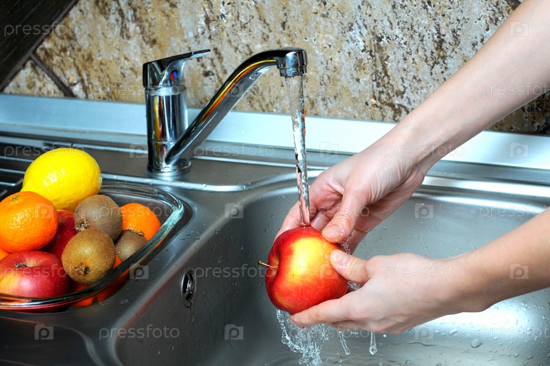 Женщина моет яблоки на кухне