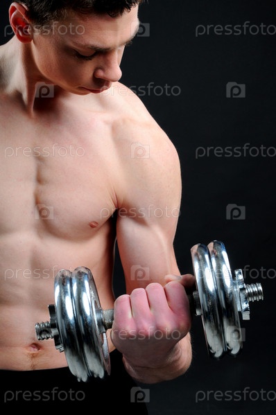 Сильный спортивный парень выполняет упражнения с гантелями на черном фоне