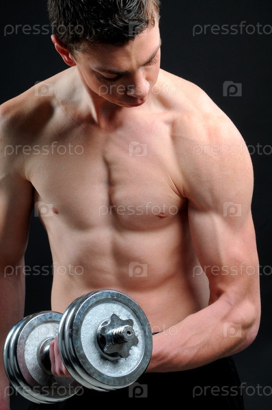 Сильный спортивный парень выполняет упражнения с гантелями на черном фоне