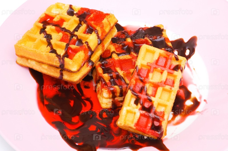 Бельгийские вафли с фруктовым и шоколадным сиропом крупным планом
