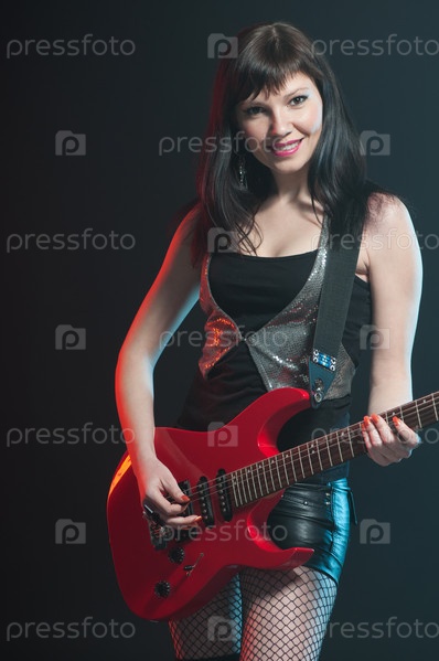 Привлекательная молодая женщина с электрической гитарой, черный фон