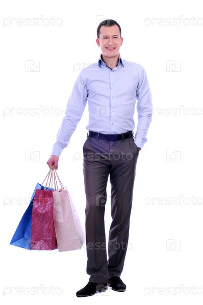 Мужчина с покупками на белом фоне