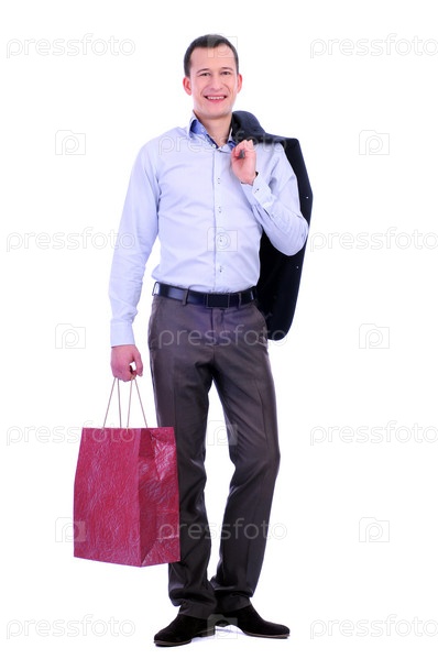 Мужчина с покупками на белом фоне