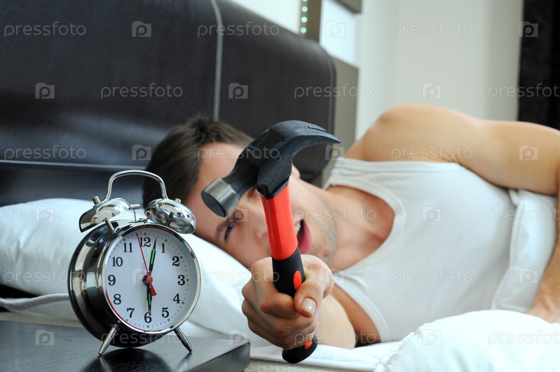 Ленивый мужчина бьет будильник молотком с постели