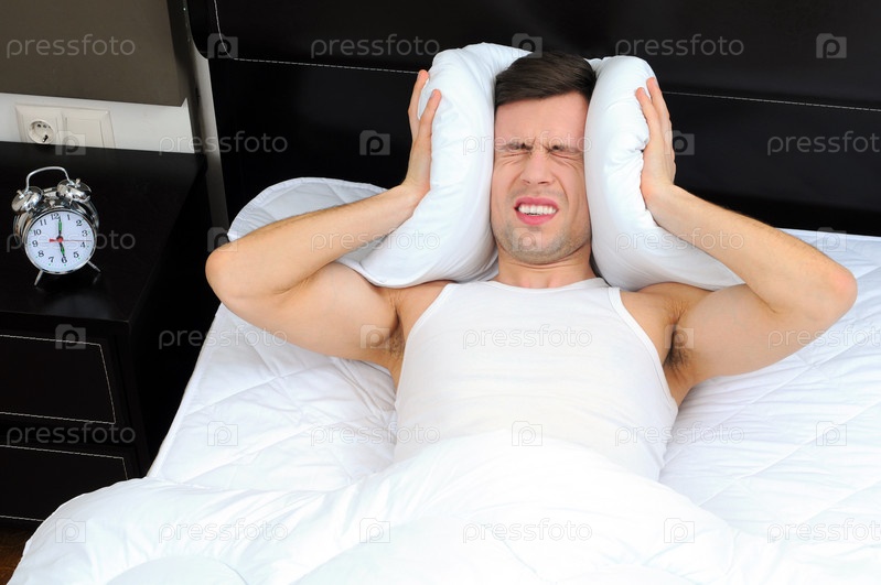 Молодой мужчина закрывает голову подушкой от звонка будильника в спальне