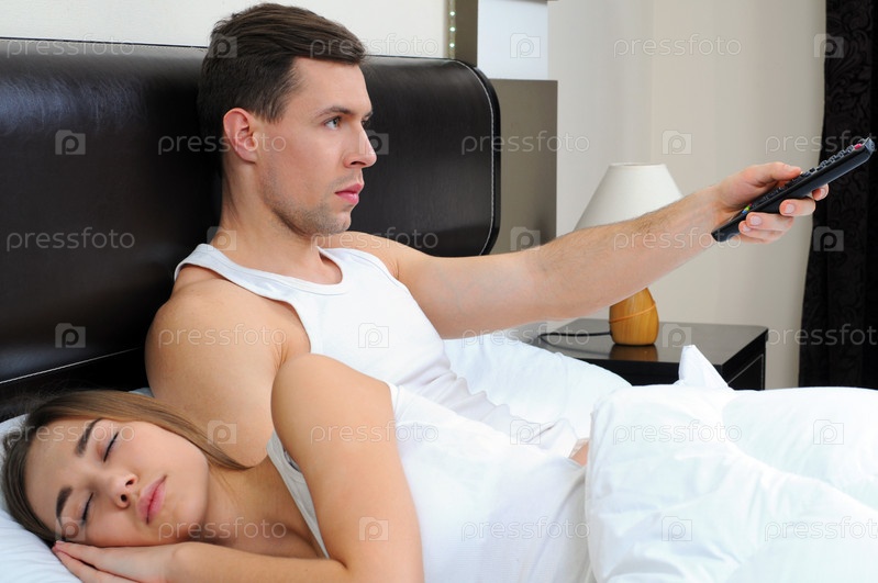 Мужчина смотрит телевизор рядом со спящей женщиной