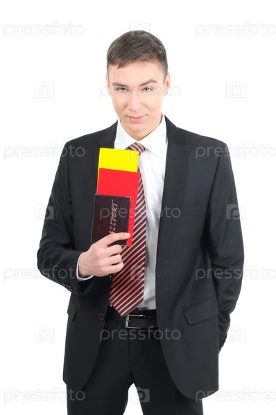 Портрет бизнесмена с документами для полета на самолете, изолированный на белом
