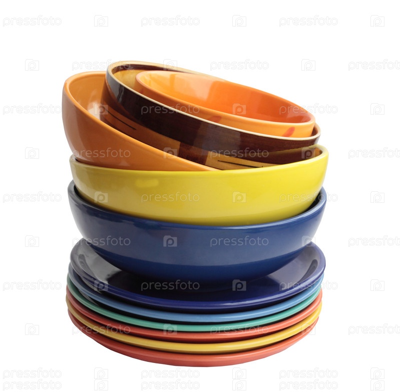 Тарелки и миски из керамики. Вид сбоку. Изолировано на белом фоне