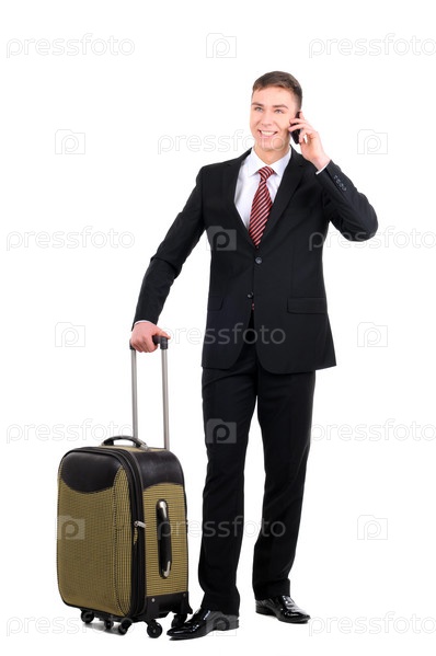 Бизнес-путешественник везет чемодан и говорит по мобильному телефону, изолированный на белом фоне