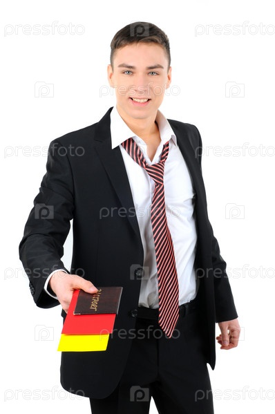 Портрет предпринимателя с документами для полета, изолированный на белом