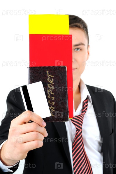 Портрет предпринимателя с документами для полета, изолированный на белом