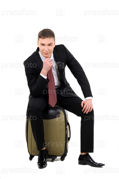Портрет успешного бизнесмена с чемоданом, изолированный на белом фоне