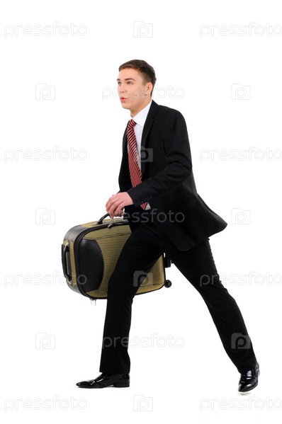 Портрет успешного бизнесмена с чемоданом, изолированный на белом фоне