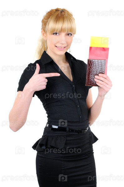 Портрет молодой женщины с паспортом и билетами, изолированный на белом фоне