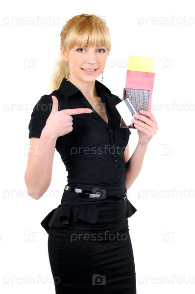Портрет молодой женщины с паспортом и билетами, изолированный на белом фоне