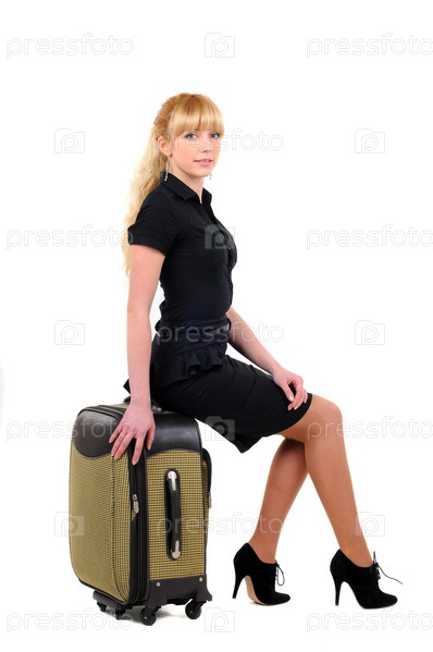 Женщина с чемоданом на белом фоне