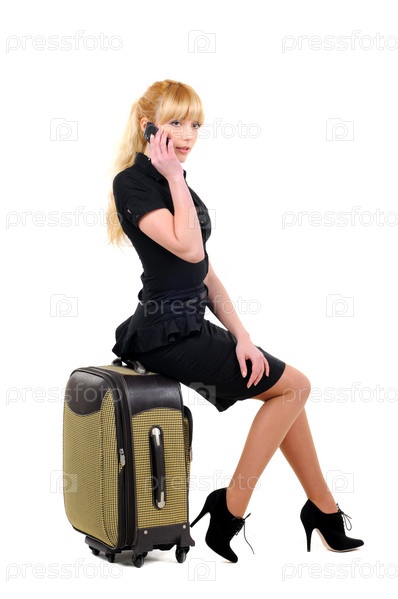 Женщина с чемоданом на белом фоне
