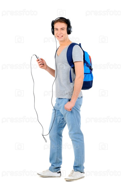 Молодой мужчина слушает музыку на белом фоне