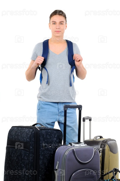 Портрет мужчины, путешествующего с чемоданом и сумкой, изолированный на белом фоне