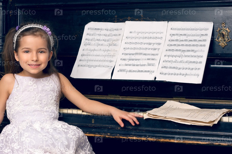 Девочка в красивом платье сидит за фортепиано